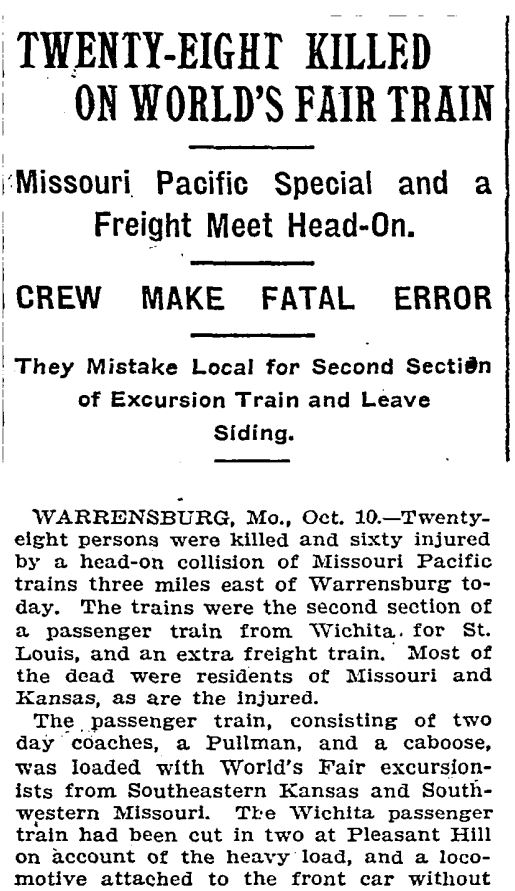 In the early hours of October 10, 1904, a sinister fate befell the second section of Missouri Pacific passenger train No. 30, bound from Wichita to St. Louis. As the train neared the infamous Dead Man’s Curve, a sharp bend three miles east of Warrensburg, it collided head-on with an extra freight train. The crash was catastrophic, leaving 28 dead and 60 injured.