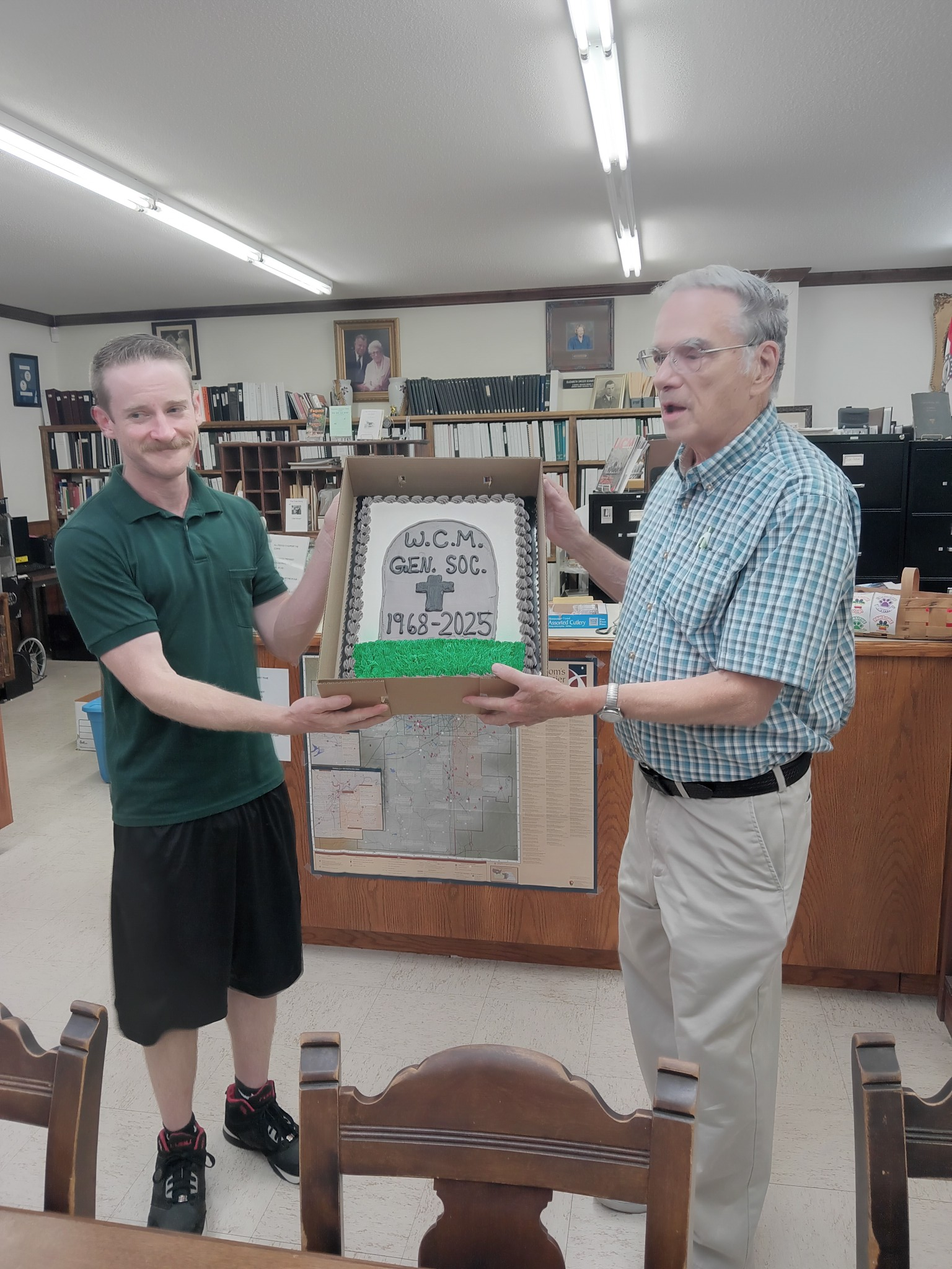 JOCOHS member Roscoe James hold the cake with WCMGS President A.J. Heck September 22,2025