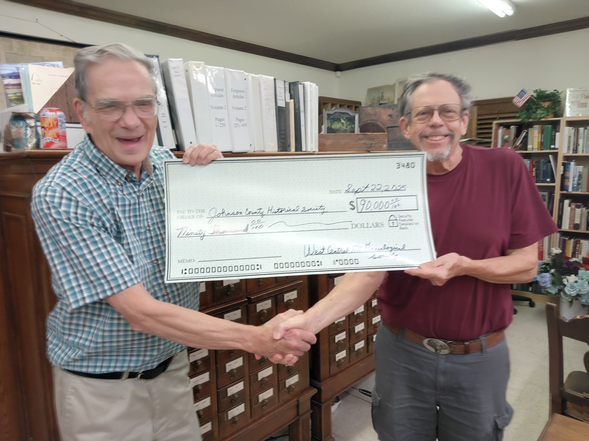 WCMGS President A.J. Heck presents JOCOHS Treasure Bill Wayne with an over-sized check. Heck later presented the JOCOHS with a real one.