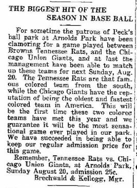 TIDBIT ABOUT THEIR NAME: The Tennessee Rats, an independent Negro team, went by the state name because the rivers of American at the turn of the century, i.e., Mississippi, Ohio and Missouri, were so polluted with garbage the rats regularly swam in them. America in the nineteenth century was just as polluted as it was in the twentieth century when government regulations finally started to clean up by the 1950s.