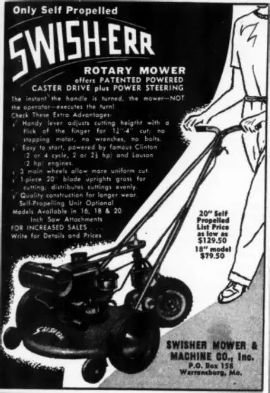 At just 22 years old, Max Swisher had designed a new kind of self-propelled rotary lawn mower, the Swish err. After two years of perfecting the design, production began under the brand name Mohawk, with early prototypes built on the Swisher family farm three miles north of Leeton.