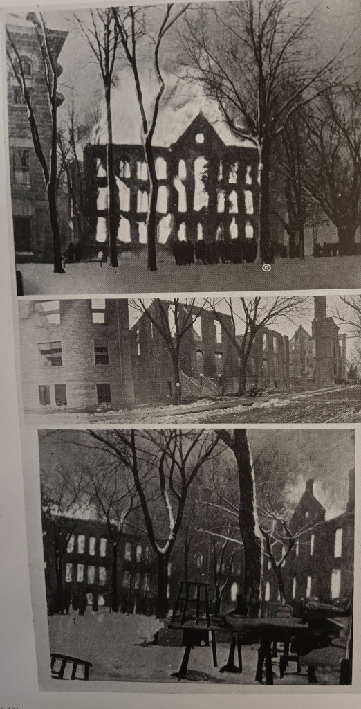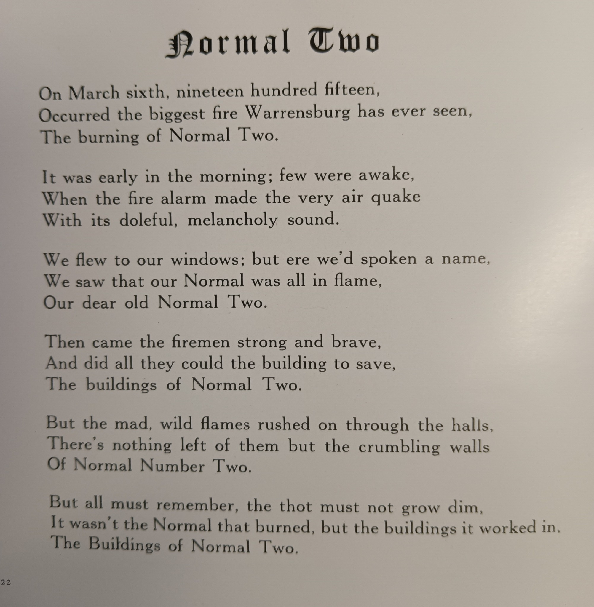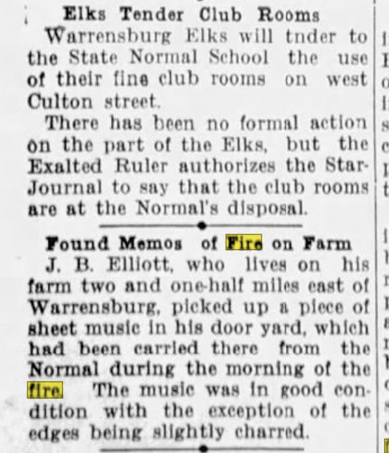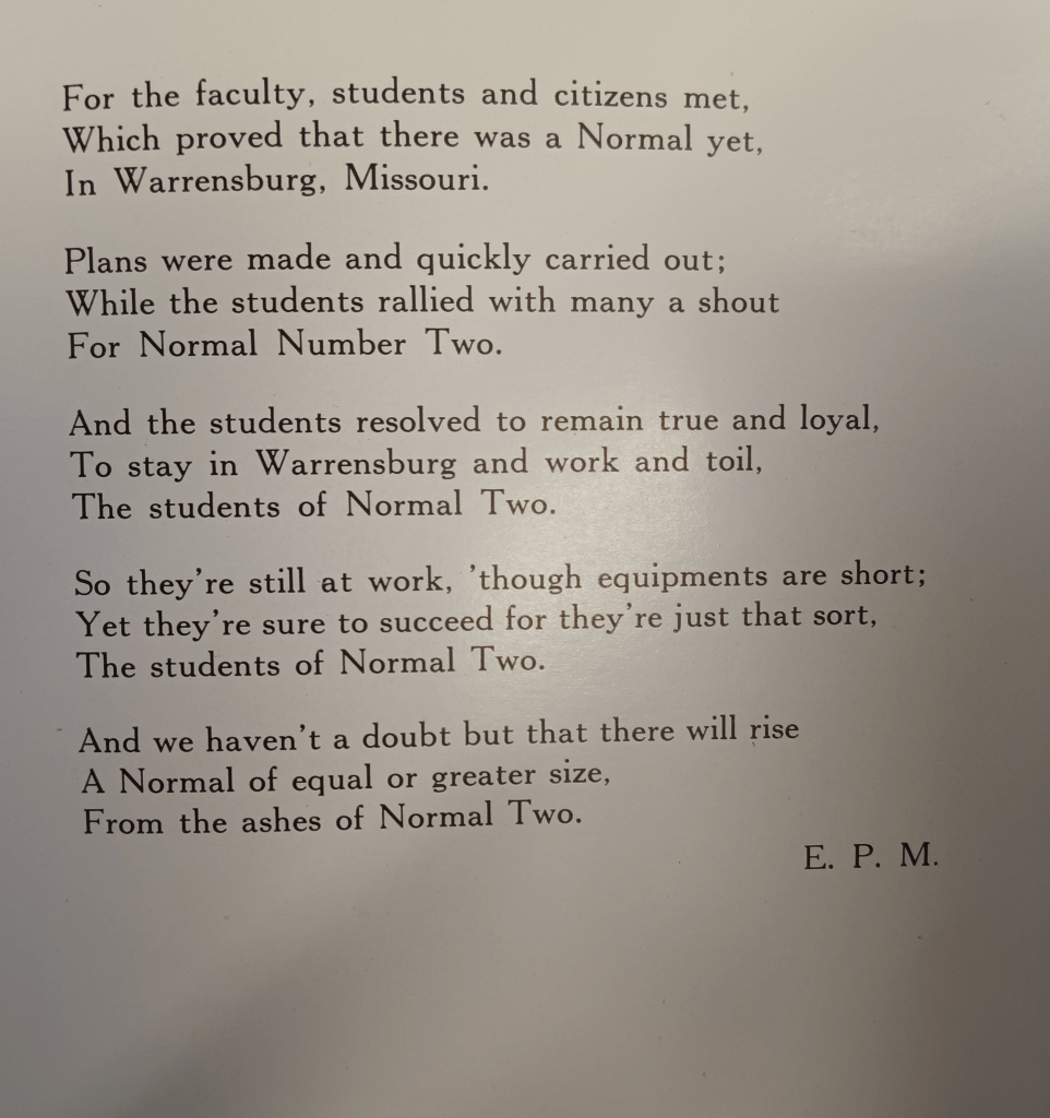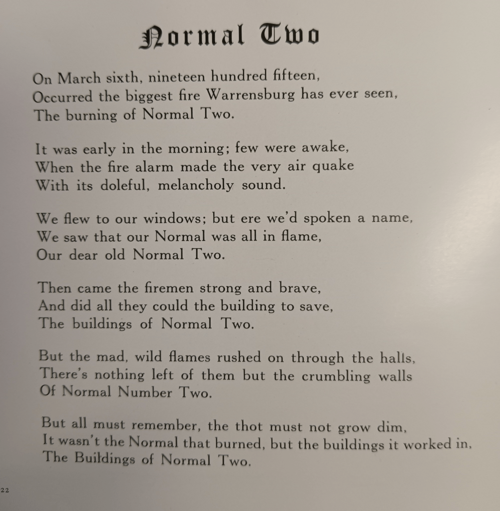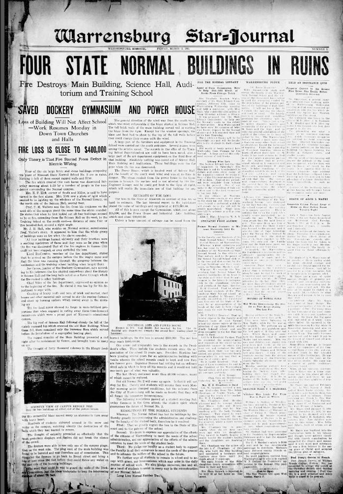 In the early hours of Saturday, March 6th, 1915, a devastating fire ravaged the Second District State Normal School in Warrensburg. The fire was presumed to have originated from faulty electric wires, which generated multiple sparks and ignited fires throughout the Academic Hall. The estimated loss at the time was approximately $400,000.