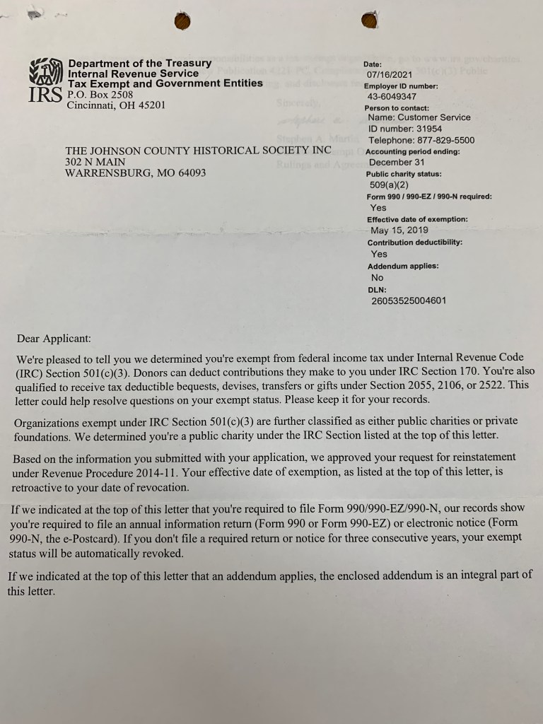 Johnson County Historical Society Inc. is 501 (c) 3 Non-profit organization .