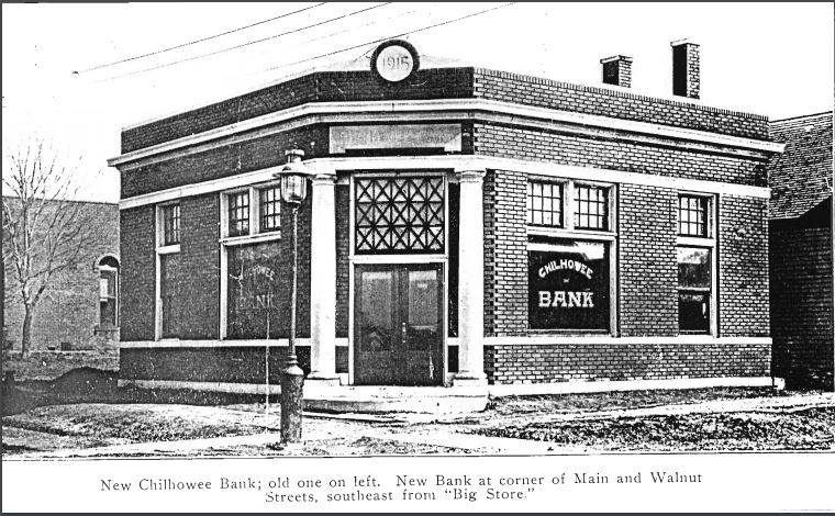 By the turn of the century, the new town of Chilhowee had expanded significantly, while the original settlement became known as Old Town. The town featured three general stores, a drugstore, a restaurant, two churches, a post office, a barbershop, a livery stable, two blacksmith shops, a telephone exchange, a lumber yard, and various other establishments. A railroad depot was constructed, and the town’s first bank, a brick structure, was established around 1900 by a man named Clevenger, whose fine home still stands today. In 1890, a newspaper, The Chilhowee News, was founded and initially edited by Victor Waters, followed by C. A. Crumbaugh. Though it experienced several interruptions, the newspaper continued publication under various editors until the 1940s.