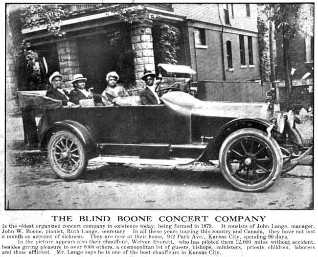He moved into a permanent home in Columbia Missouri, which is now on the national register. Besides a classical repertoire, Boone played plantation melodies, religious songs and Ragtime. He sang minstrel tunes/plantation songs, wrote and sang ‘coon’ songs as all Black performers did that came out of the minstrel stereotypes of earlier years. Religious songs included “Nearer My God to Thee” and others. In 1912, he was contacted by the QRS Piano Roll Company and became one of the first black artists to cut piano rolls. Boone gave generously to black churches and schools, and at one time he had had an income of $17,000 per year. Boone gave many benefit concerts to further Black schools and churches in the Columbia area. He was just 5 feet tall but was a very impressive figure. Because he could not walk without guidance, he frequently carried a child upon his shoulders as a navigator. He had an astounding memory and was called a walking encyclopedia.