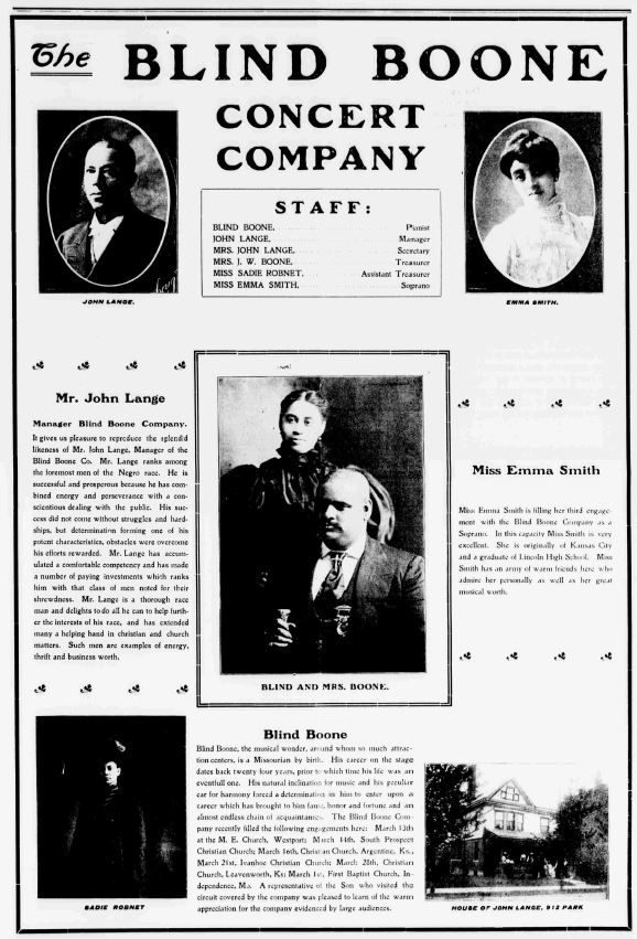 Lange began by sending John William to Christian College in Columbia to further his musicianship introducing him to the European classical composers. Further, Lange’s organizational skills were outstanding. To transcend the stigma of disability, Lange adapted the motto, “Merit, not sympathy, wins” for the J. W. Boone Music Co. To make significant Boone’s capacity to reproduce anything he heard, Lange made it known that one thousand dollars would be given to anyone who could stump him by playing something the artist could not play back accurately.