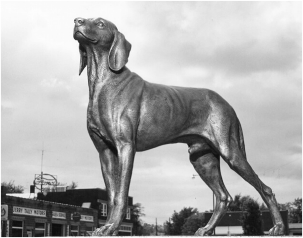 In 2017, Old Drum became the official historical dog of Missouri. Drum, owned by Charles Burden, was a black and tan hunting hound whose shooting death became the subject of a long series of court cases leading up to an 1872 Missouri Supreme Court decision. On the night of Oct. 28, 1869, Samuel Ferguson shot and killed the dog after his uncle, Leonidas Hornsby, spotted him on property he owned. Because Hornsby allegedly coaxed Ferguson into it, Burden sued Hornsby for $100 in damages.