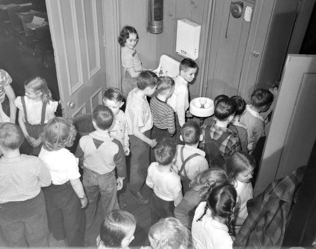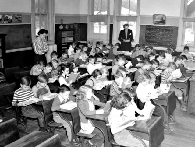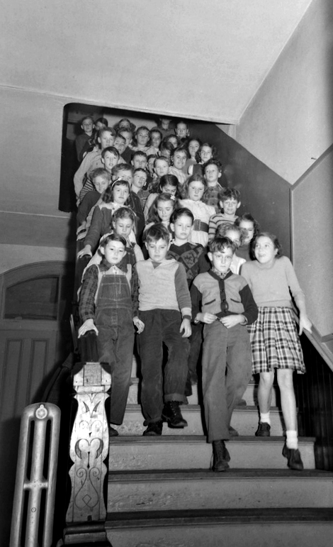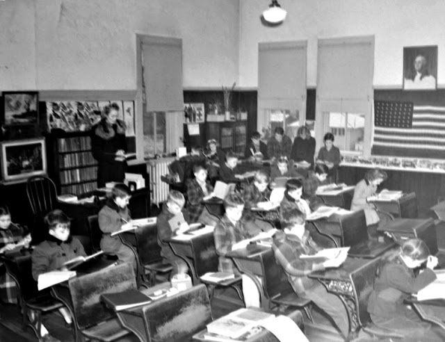 Pictures likely taken by the superintendent Fred House in the 1940’s to prove to the city that a new school was needed. Notice the kids and teacher all bundled up from the cold. The coal furnace could not keep up.