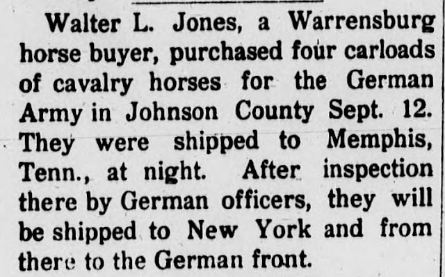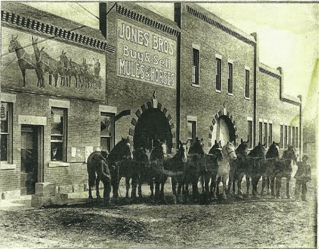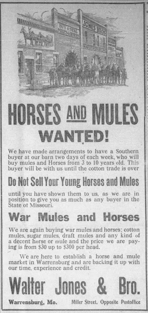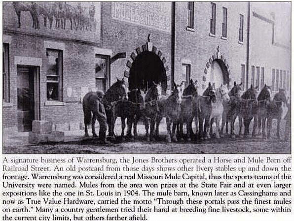 Written by Joyce Dorrell for The Johnson County Historical Society. Resources found in JOCOHS archives. Jones Brothers/ Agriculture/Missouri Pacific R R/Business of Warrensburg/ Daily Star Journal/Standard Herald/Mules of Missouri