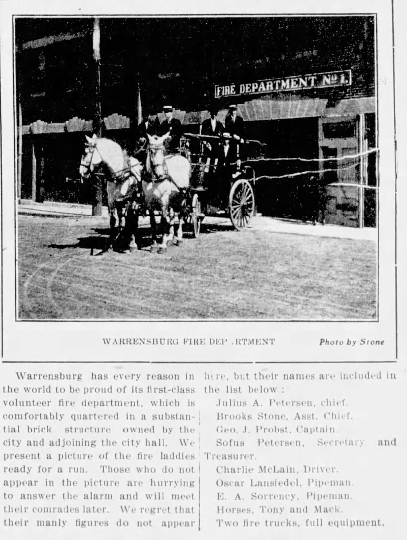 - In 1909, a fire started in the morning that destroyed Warrensburg buildings and stocks valued at over ten thousand dollars. J. C. Thiele of the shoe store received $1000 in insurance money due to the burning of his business. It was claimed to be the worst fire in 30 years.