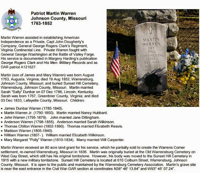 MARTIN W. WARREN: Martin came to Missouri in 1819, first to Howard Co., then Lafayette Co., then to Johnson in 1832.