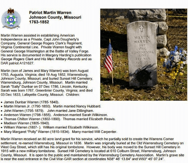 MARTIN W. WARREN (JAMES, SAMUEL, WILLIAM, JOHN) was born Aug 1763 in Augusta Co., Virginia, and died 18 Nov 1852 in Johnson Co., Missouri. He married (1) SALLY DUNBAR Bet. 1775 – 1780 in Lincoln Co., Kentucky, daughter of JOHN DUNBAR and SARAH CHILTON. She was born 1765 in Amhurst Co., Virginia, and died 1833 in Lafayette Co., Missouri. He married (2) RUTH COLE Abt. 1835. She died 06 May 1845 in Dover, Missouri.
